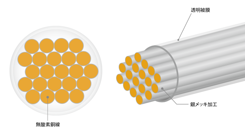 1芯あたりに高純度無酸素銅を23本使用することで、伝送ロスを抑えケーブル本来の能力を発揮します。 また、8芯構成により定位感と情報量を飛躍的に向上。さらに、銀メッキ加工を施すことで、 低域の音圧を維持しながら音の輪郭や高域の明るさを明瞭に表現します。 繊細かつ力強いメリハリのあるサウンドを実現します。