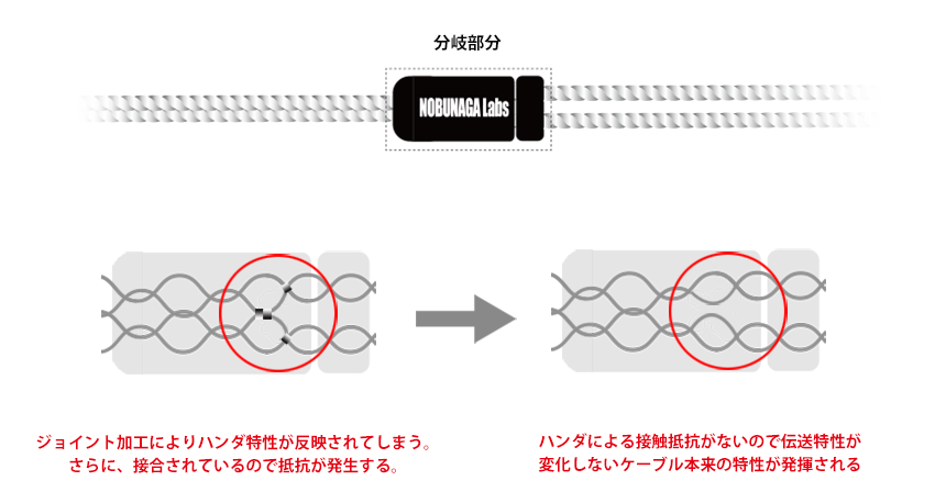 電気抵抗の原因となる分岐部分のはんだ接合工程(ジョイント加工)を施さず、 ケーブルの編込みピッチを均等化するため、ひとつずつ手作業で編み込み、 伝送特性が変化しない理想的な設計を実現。ケーブル本来の特性を余すことなく発揮します。