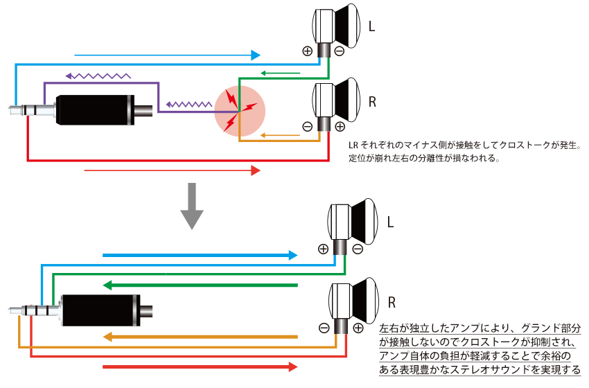 バランス接続は、プレーヤーのLRそれぞれ独立したアンプを使用することで、クロストークが 極限まで抑制され、より正確な定位感と空間表現を可能にします。8芯編み込み構成は、 バランス接続の効果を最大限に発揮できるよう設計しています。