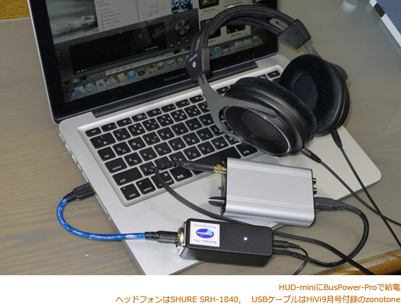 やはり期待を裏切らない音だ。低域にも十分な力があって中域高域は滑らかで聴き疲れしない。 これで13,980円?と感心することしきりである。たくさんある低価格USBヘッドフォンアンプの中でも中身の作り、回路、基板どれをとっても最高ランクであると思う。また例によってOPAMPを変えられる。 では、オーロラサウンド社のBusPower-Proから給電してみよう。 これは私が所属するところの製品で恐縮であるがこういうUSBヘッドフォンアンプにはぴったりである。そのままPCと本機の間に入れるだけである。うーんやはりいい。自分のところの製品を褒めても読んでいる人はしらけるかもしれないが、このBusPower-Proとの相性は抜群である。ACアダプタがスイッチング式でなくノイズの少ないトランス式なので少し大きくて重たく、夏はちょっと暖かくなるが10,500円でこの効果があればオーディオアクセサリとして、不足はないだろう。女性ボーカルのエバキャシディを聴いたが、ハスキーな声にさらに乾いた色気を感じた。(試聴曲 : Songbird)